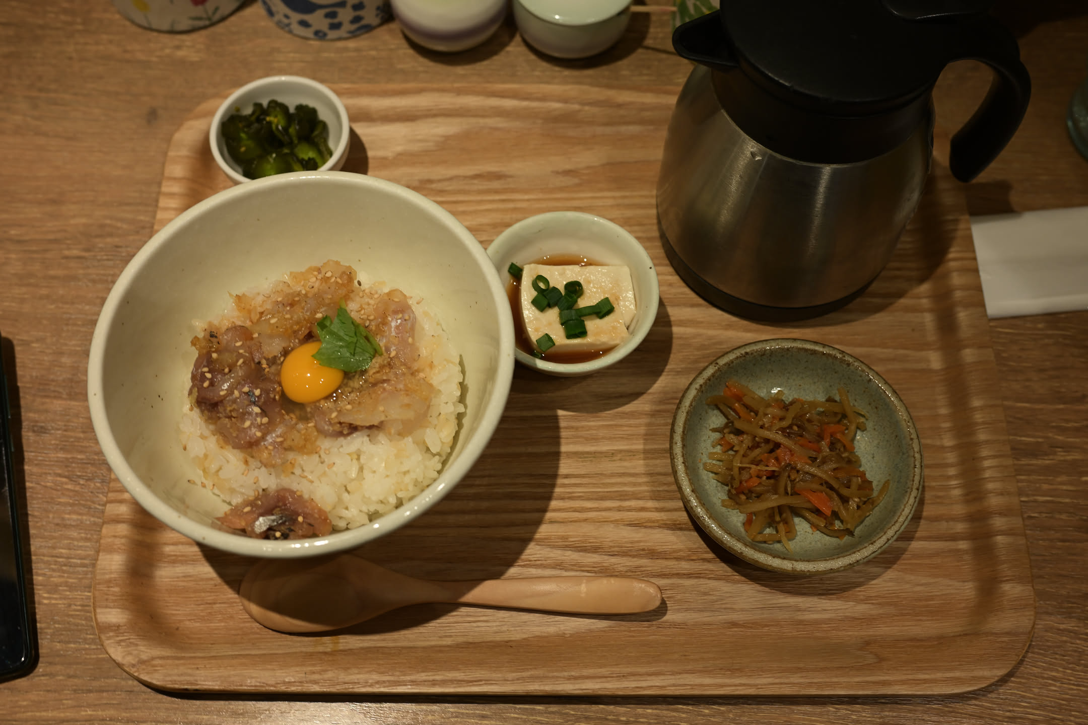 我点的是 “真鯛のごま和え茶漬け”,壶内盛着泡饭的茶,前方摆放着可自行添加的鱼干和海苔。十分清淡几乎没油,但比较咸口,齁咸的那种,量比较小,吃完后不知为何心想,果然日本的味道就该是这样啊。对我来说属于是喜欢但不会天天吃的味道,还是中国菜吃的上头,而且这个量确实很难填饱中国人的胃袋,也没什么蔬菜,请至少保持四分之一的蔬菜呀。